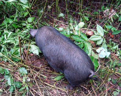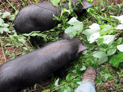 Hog piglets are foraging in our pasture. They will eat just about anything