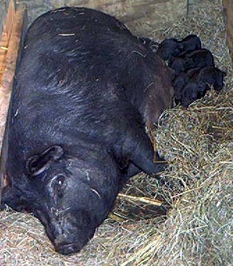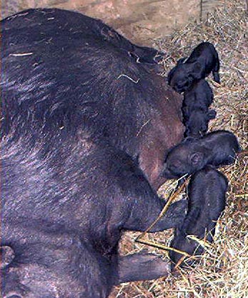 Guinea Hog mothers are easy going and allow the farmer to be next to her