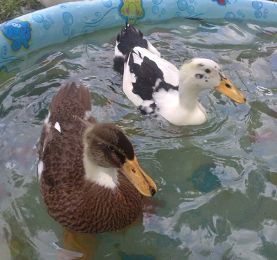 Ancona duck and a Black and White Ancona duck enjoying their kiddie pool.