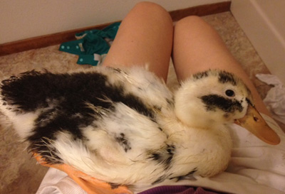 Ancona duck named Kondra is 6 weeks old. She loves sitting on laps. The