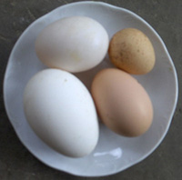 In the photo of eggs on a plate, from large to small: goose, duck, chicken,