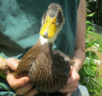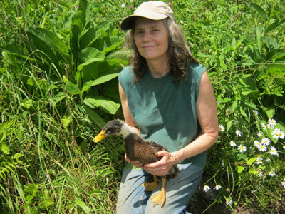 photo is Nancy with a 1-month-old male Tricolor Ancona duckling. In the