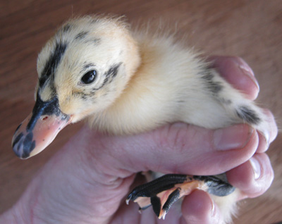 is the 1-month-old duckling. I love the cute spot on his beak.