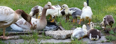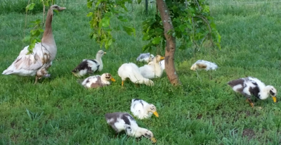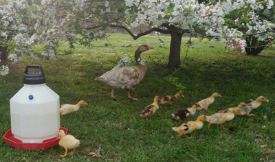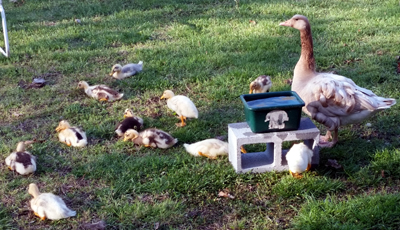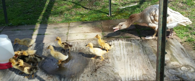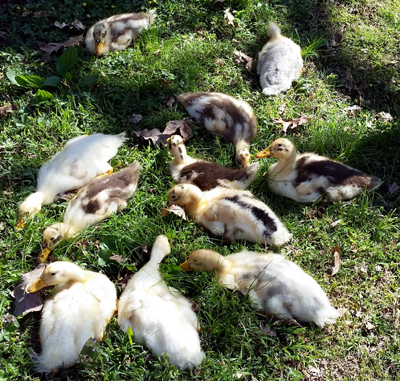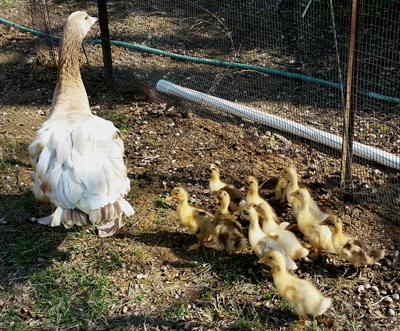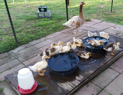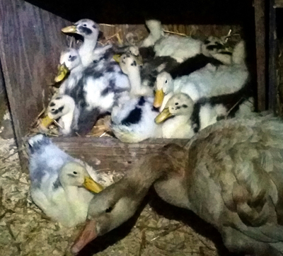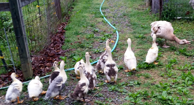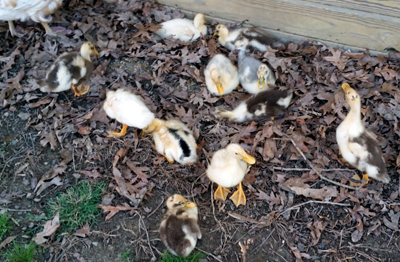 Ducklings at 2 weeks. "I added Bonne (Betsey's sister) on Monday night because she had been pacing both the night stall divider as well as the chicken wire temporary nursery yard fence. She appears to have absolutely no parenting desires whatsoever, but she is nonaggressive, and Betsey seems completely comfortable with her sister being so close to her babies. Mud is the order of the day today....BAD ducks! Digging holes in the yard! This is why Dave Holderread's book says not to allow ducks out on turf when it's wet! Check out the one doing an ostrich impression!"
