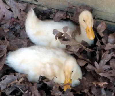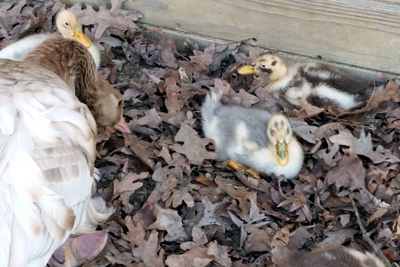 Ducklings at 18 days. "This appeared to be the day they discovered leaves! They went nuts rummaging around and chattering! The little females tiny quacks of excitement were just too cute."