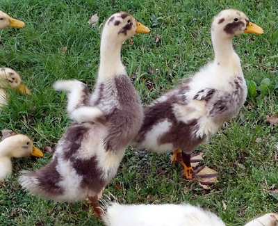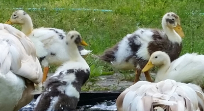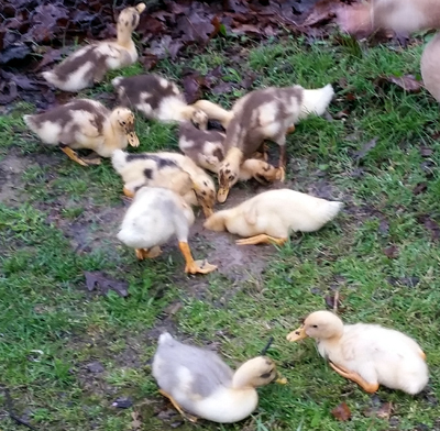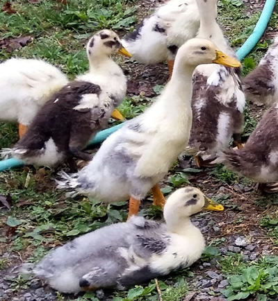 Ducklings at 19 days. "Look at all the colors! I especially like the blue one in the front right here. At this age, I thought I heard it quack, but I was mistaken. It has since proved to be a drake. The other blue drake is a richer, darker color, but I like this one better. As you can already see here, this one has a more broken pattern. And I actually prefer the softer, more pastel blue against the white."