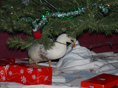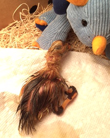 has two curly tail feathers. He loves the little dogs stuffed toys and their