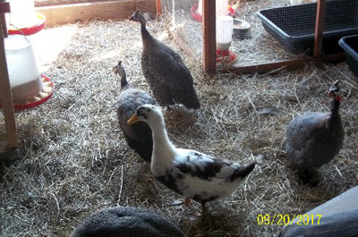 The duck with the Guineas is 'Big Duck' aka 'Mr. McDuck'. Her Guineas are