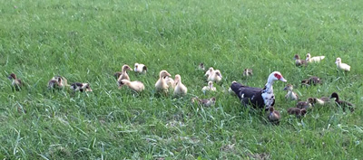 duck. There are Muscovy and Ancona ducklings with her. All the ducklings