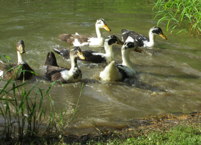 of Ancona ducks in a pond enjoying the good life. This photo is from Bryan