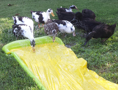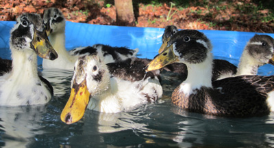 of older Ancona ducklings by their kiddie pool / "pond". Photo