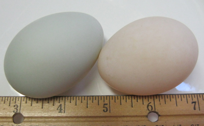 few lay green eggs. Their eggs are larger than chicken eggs.