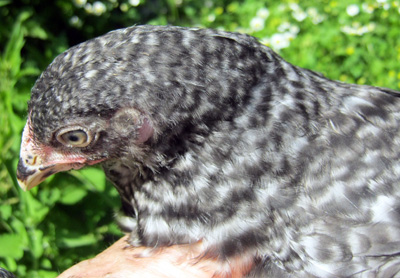 This photo is a 7-week-old Dominique pullet.