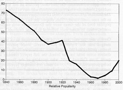 This graph shows the relative popularity of the Dominique from 1840 to 2000.