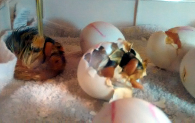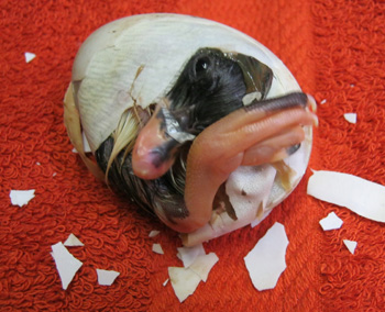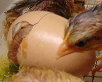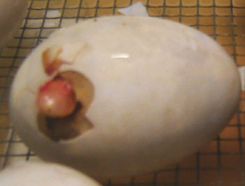 half over face. He pipped a hole, and I could see his poor little beak quivering.