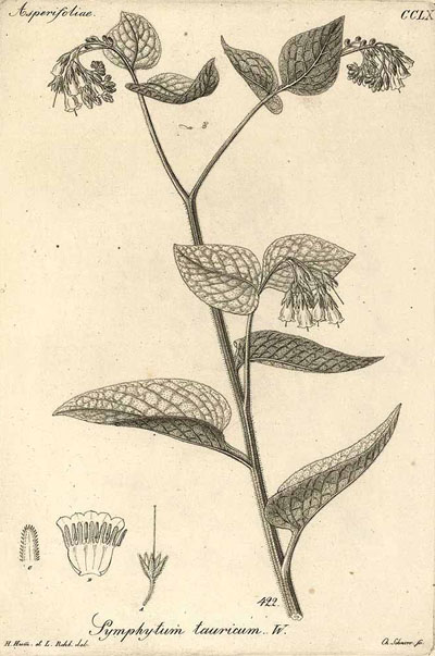 “To promote the union of bone. Take Comfrey, and bruise with wine, pepper and honey, drinking it daily for nine days, and they will unite compactly.”