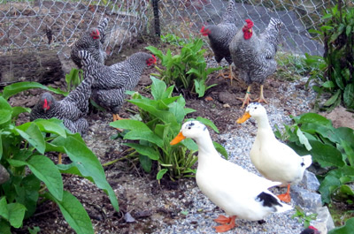 This photo is Dominique chickens and Ancona ducks in comfrey. Those