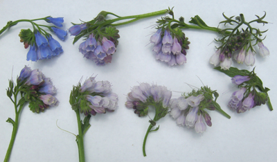Prickly comfrey blue flowers fade to lighter shades as it withers away.